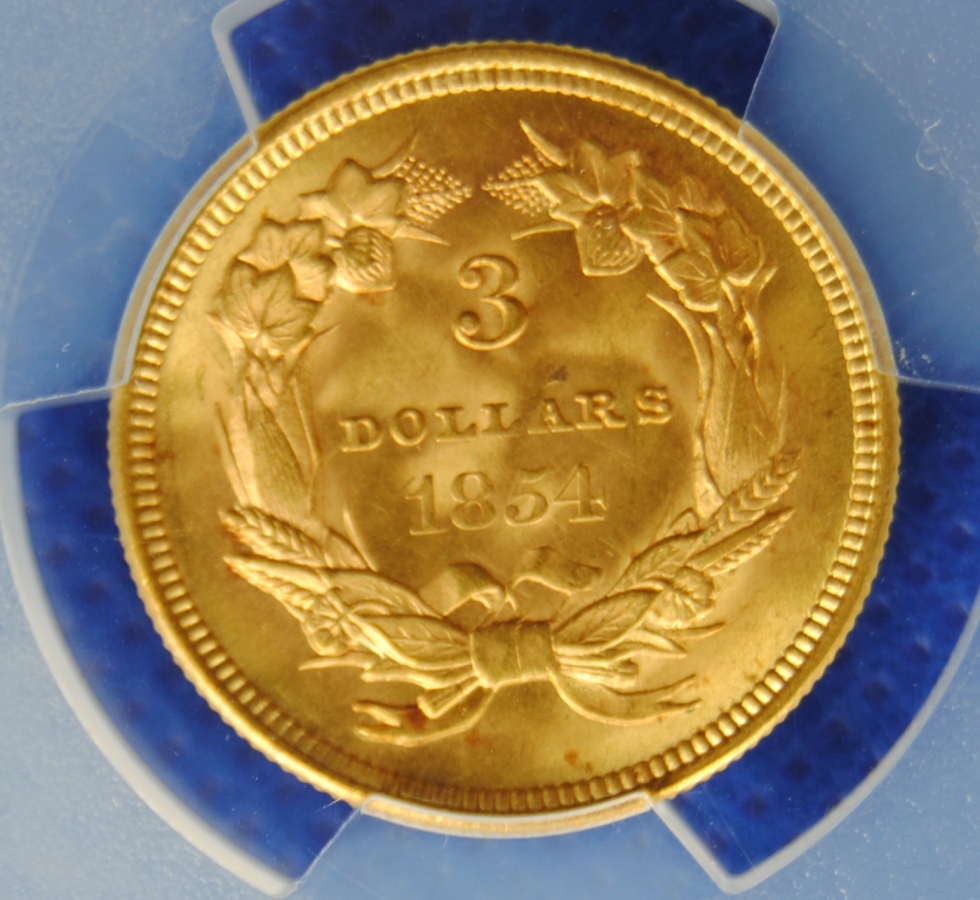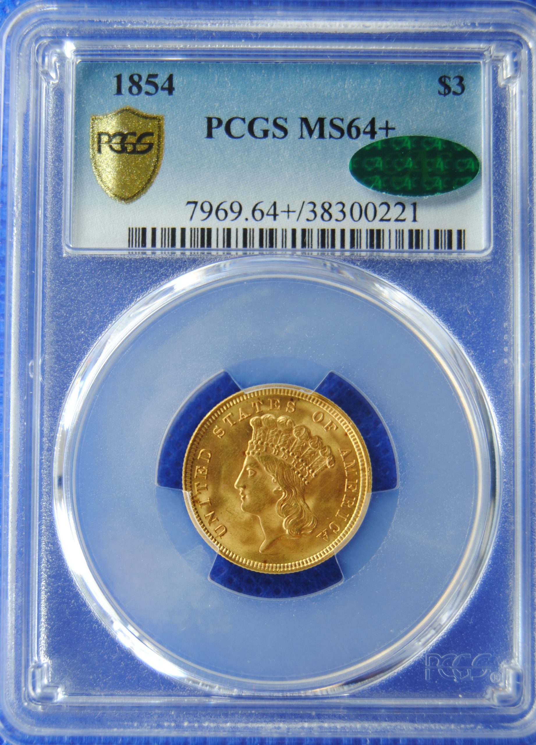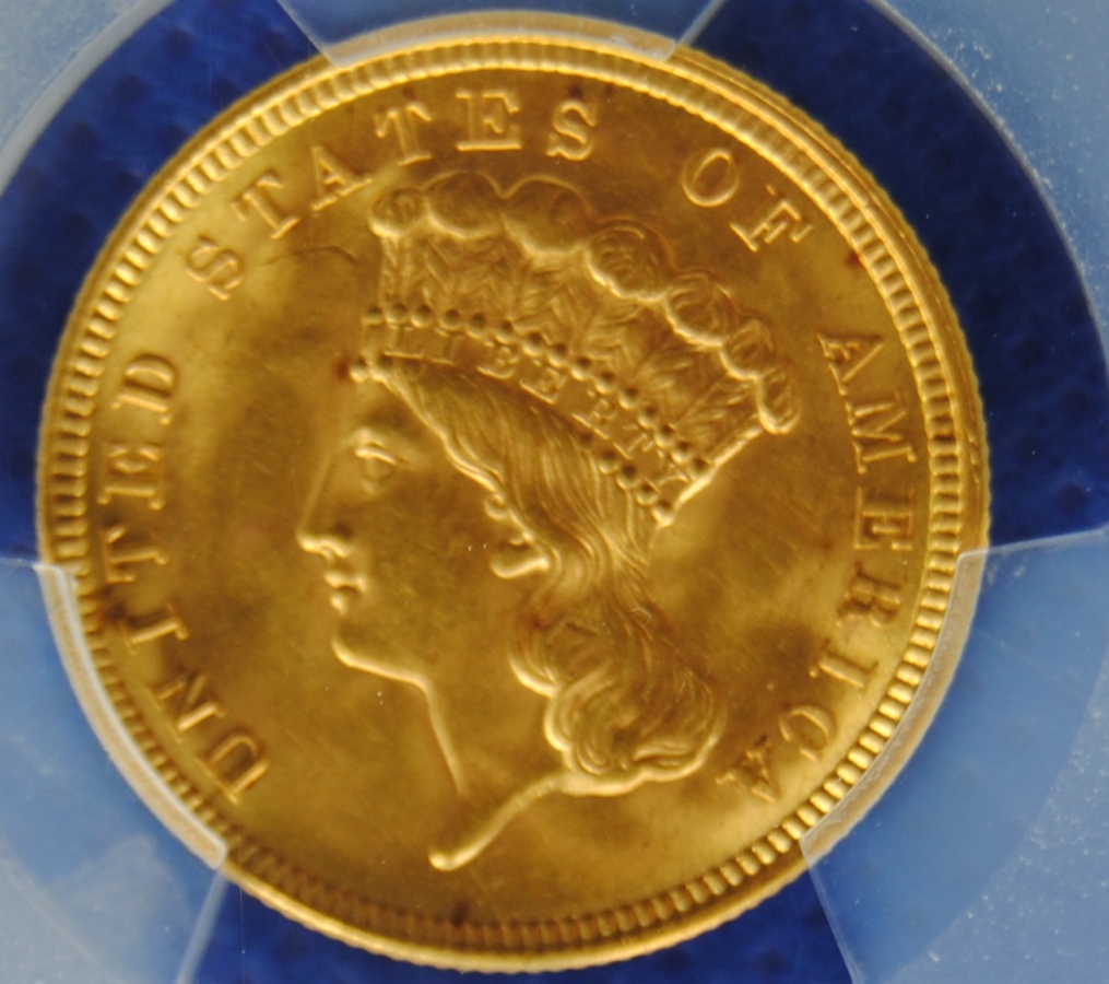 A Superb gem $3 dollar gold piece. Would be ms-65 or higher save for a lint mark on the obverse field from “S” in “STATES” toward the head dress . Great type coin. (CAC) approved.
