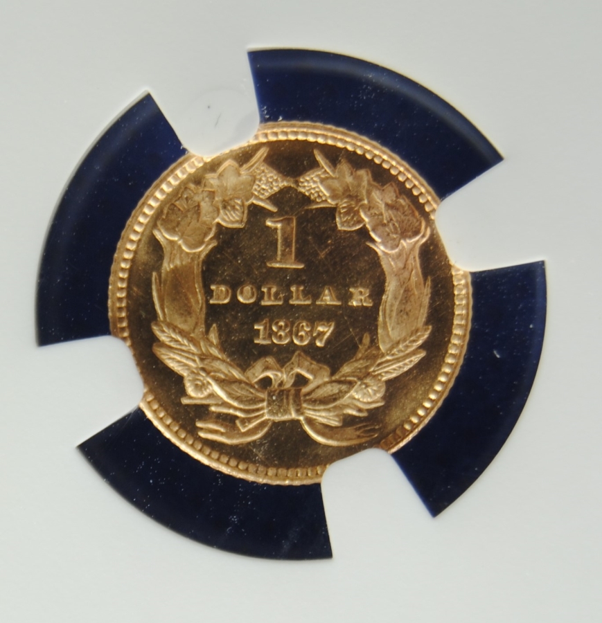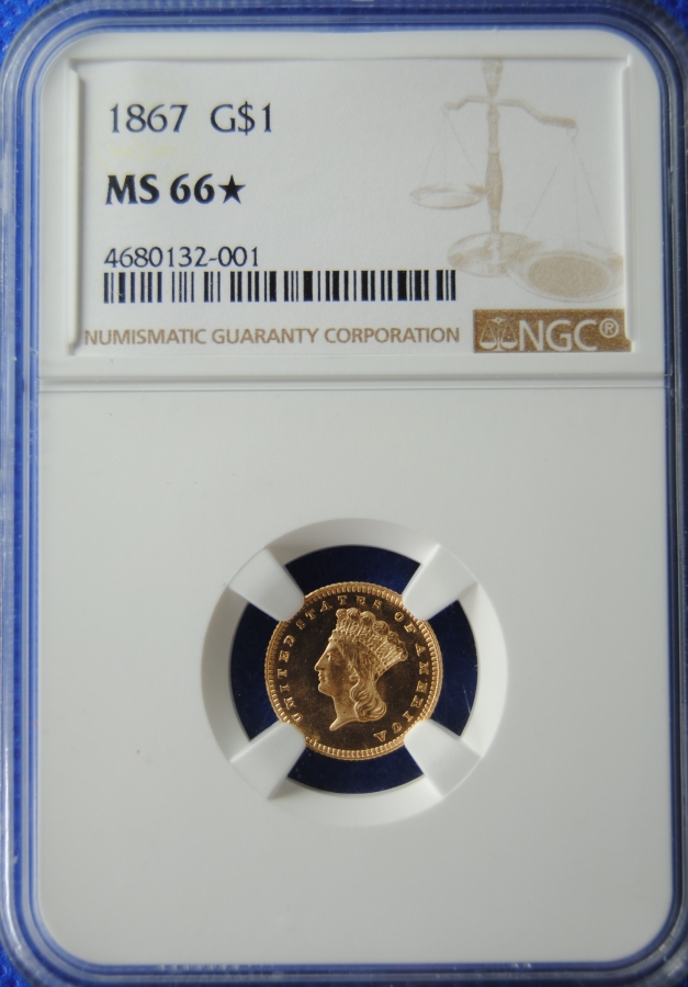 Rare 1867 gold dollar in the ultimate grade with a pop of 3 but the only Star designated for the date. An opportunity to acquire a great type or date for a registry set.
